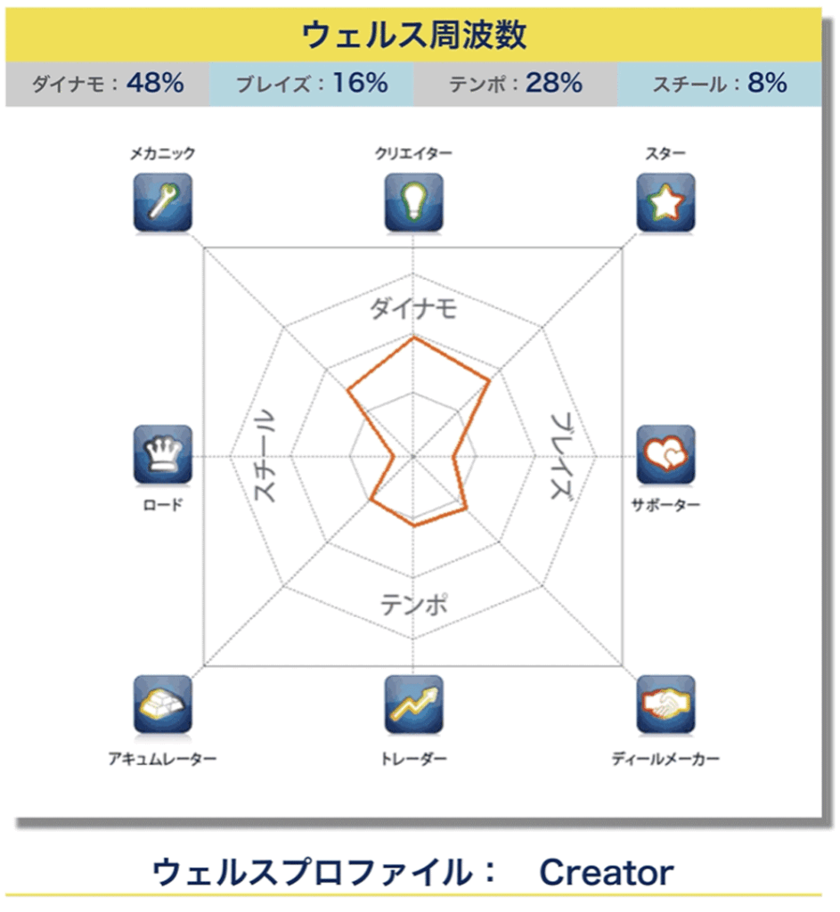 この方のクリエイターというタイプは上側のダイナモという領域(48%)が本来の性質のホームポジションとなります。その強み、才能が最も発揮できる領域です。